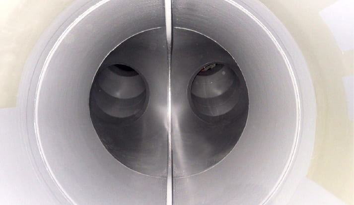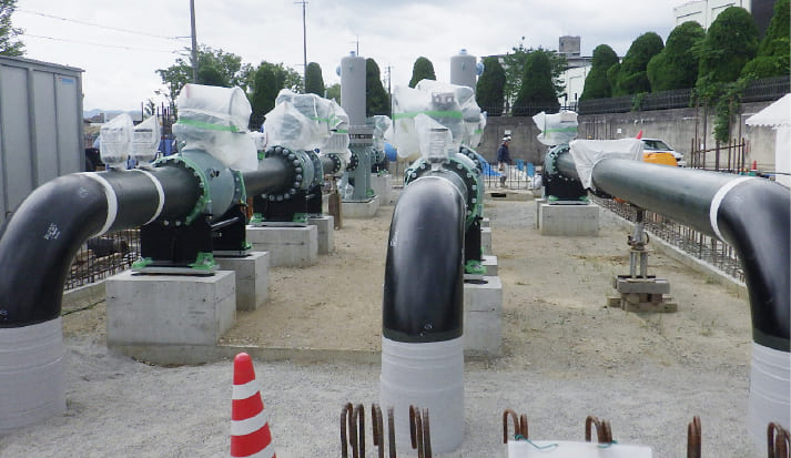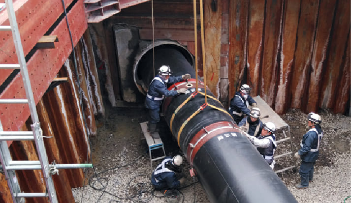 既設管更新工事におけるPIP工法の一例(管径1150mm) 既設管に新しい鋼管を挿入して立坑と呼ばれる場所で